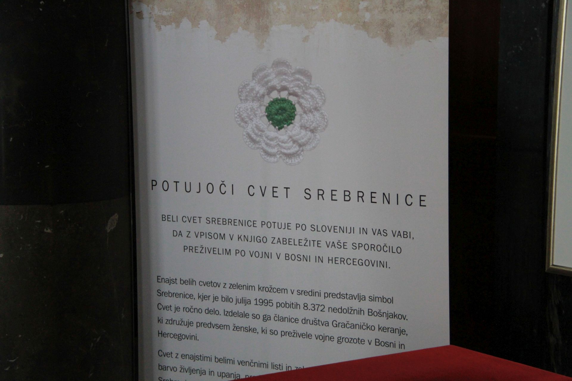 Svojo pot je cvet Srebrenice simbolno začel včeraj, 03.03.2015 v Narodni in univerzitetni knjižnici v Ljubljani, kjer bo ostal do 20. marca. Sprejela nas je ravnateljica Martina Rozman Salobir, ki se je med prvimi vpisala v knjigo »Sporočila Srebrenici«. Cvet bo kasneje potoval v Maribor in druge kraje po Sloveniji.